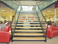 Euromech designed a triple-flight feature staircase at the entrance of the store leading up to the mezzanine level. Attractive glass-infill balustrades were installed within the handrail on the stairs as well as on the open sections of the mezzanine floor. The stair treads were supplied in white oak with a special hardwearing, slip resistant insert. All of which combine to make an extremely attractive and durable finish. Total Floor Area of Mezzanine: 512 square metres |